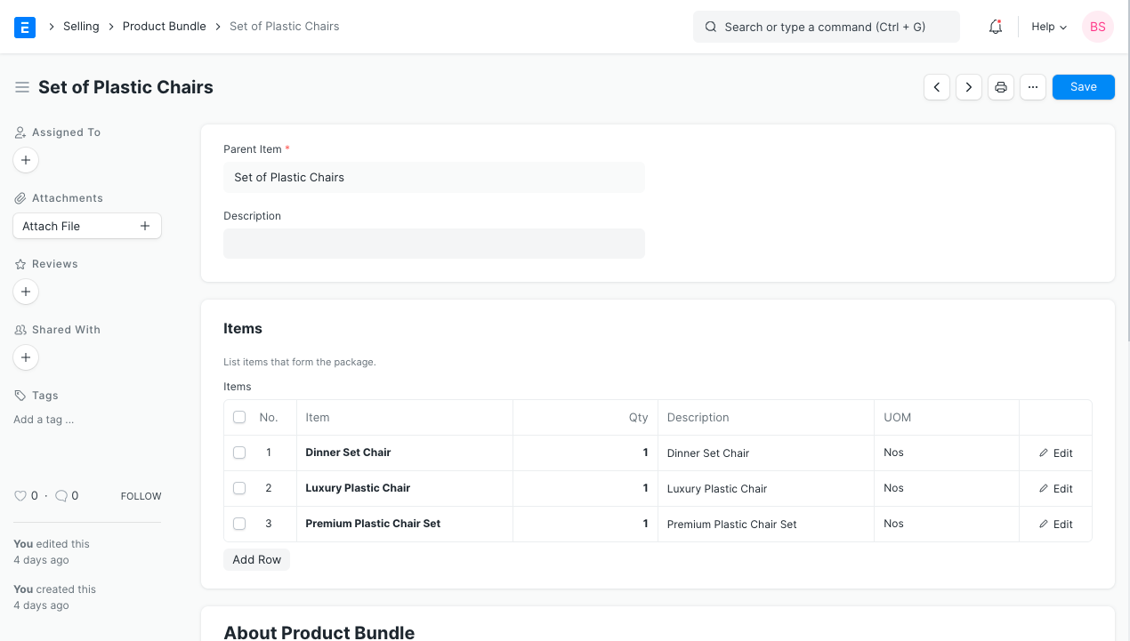 Por ejemplo, cuando vendes un smartphone, tienes que asegurarte de que el cargador, el cable y el pin expulsor de la SIM se entreguen con él y que los niveles de existencias de estos artículos se vean afectados. Para abordar este escenario, puede crear un paquete de productos para el artículo principal, es decir, el teléfono inteligente. A continuación, enumere los elementos entregables, es decir, teléfono inteligente + cargador + cable + pin eyector de la tarjeta SIM como los llamados "artículos secundarios".