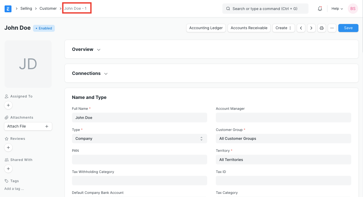 Nombre del cliente: Si el nombre del cliente debe usarse como identificación, seleccione 'Nombre del cliente' en Nombre del cliente por. En este caso, si crea dos clientes con nombres idénticos, - 1 tendrá el sufijo del segundo cliente.